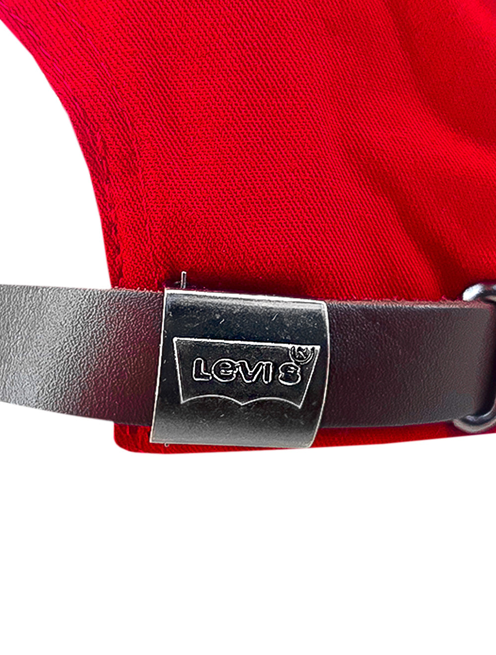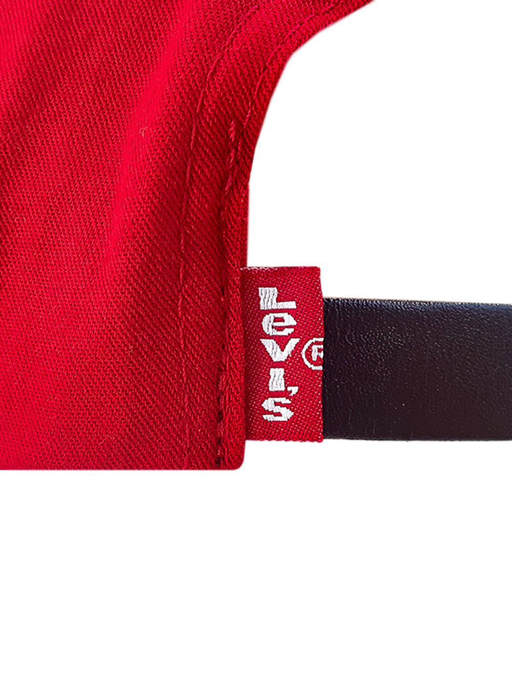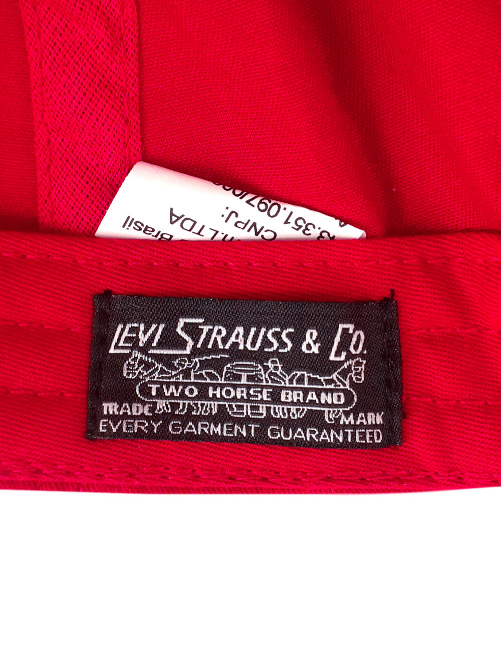 Etiqueta Levi´s da marca nas cores amarela e branco fixada na parte externa da regulagem.