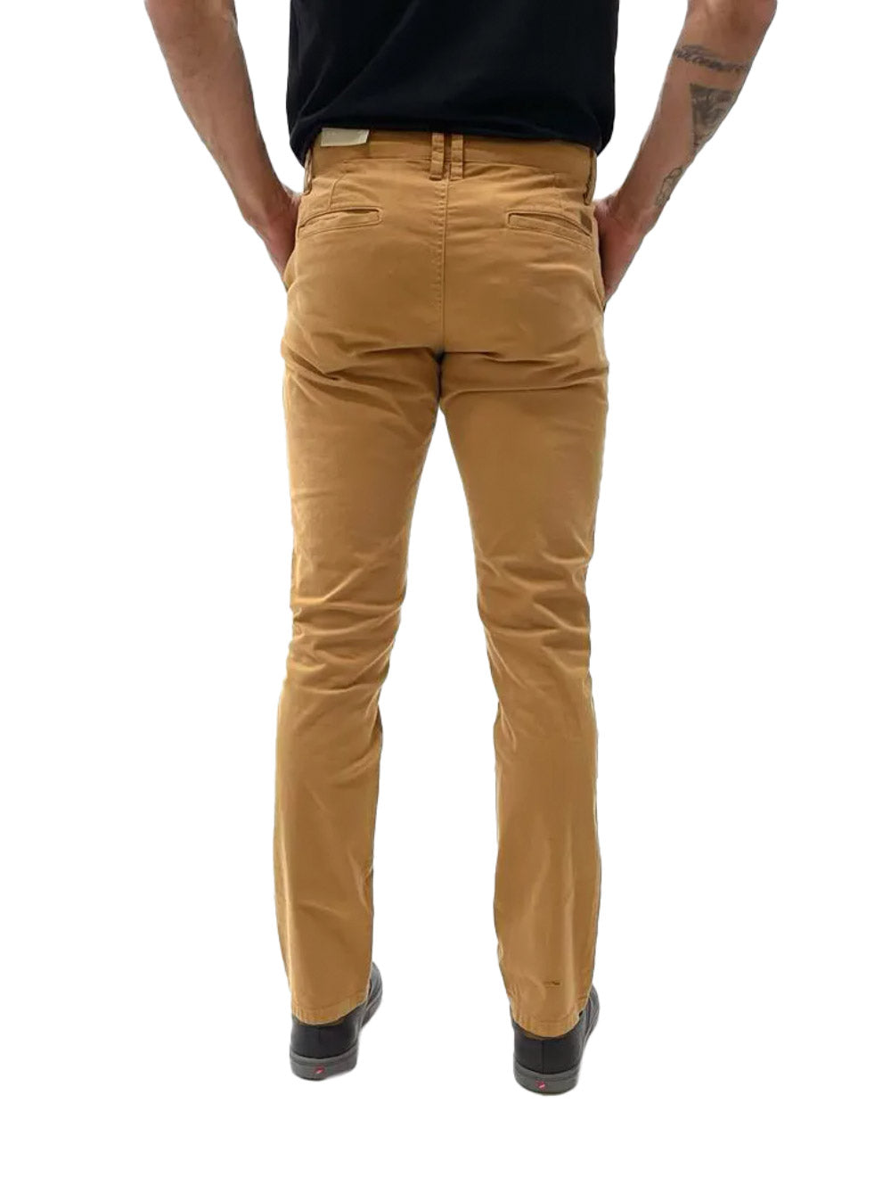 Dois bolsos frontais no estilo faca e dois bolsos posteriores embutidos.