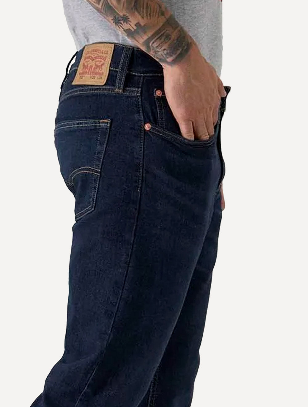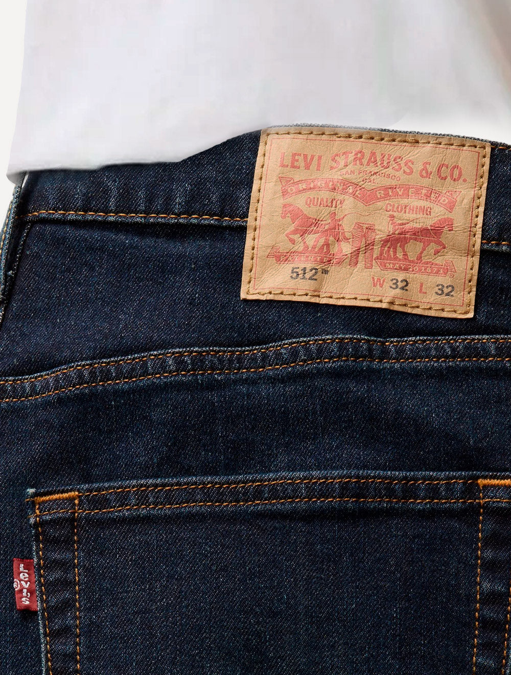 Etiqueta Levis 512 na parte posterior da cintura, acima do bolso direito, nas cores preto e cinza.