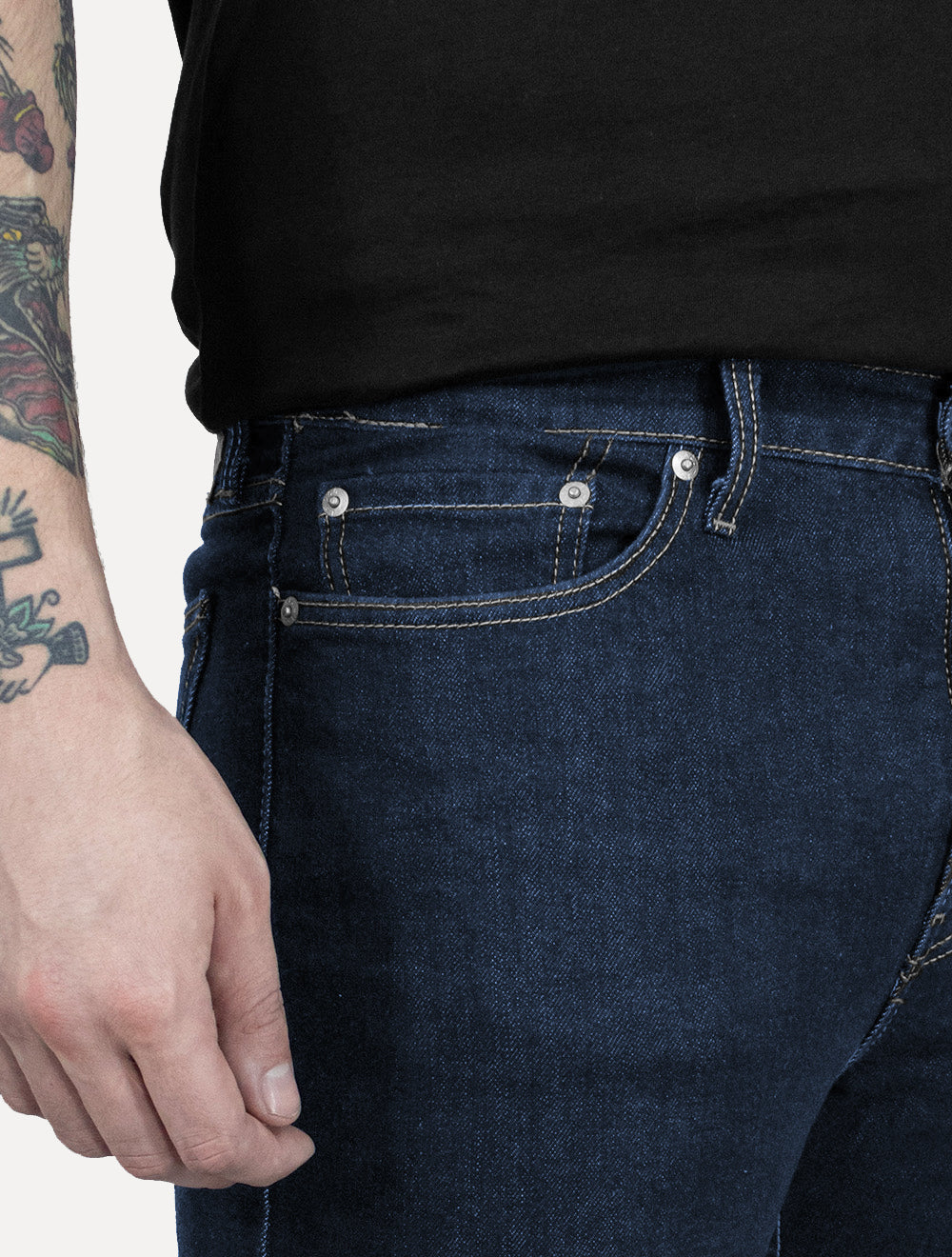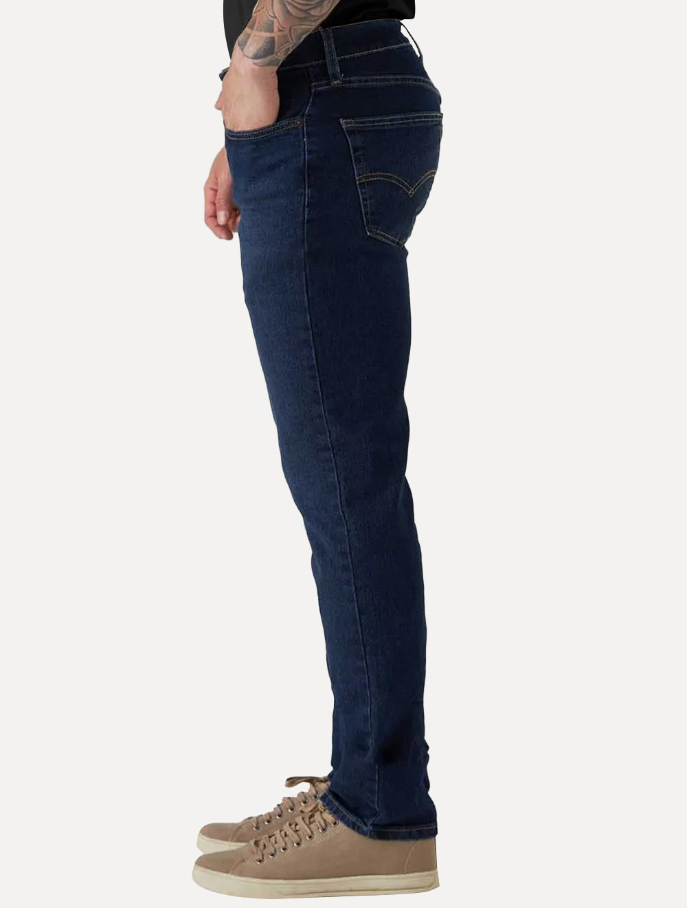 Composição: 99% Algodão, 1% Elastano. Forro de bolso: 50% Algodão, 50% Poliéster.