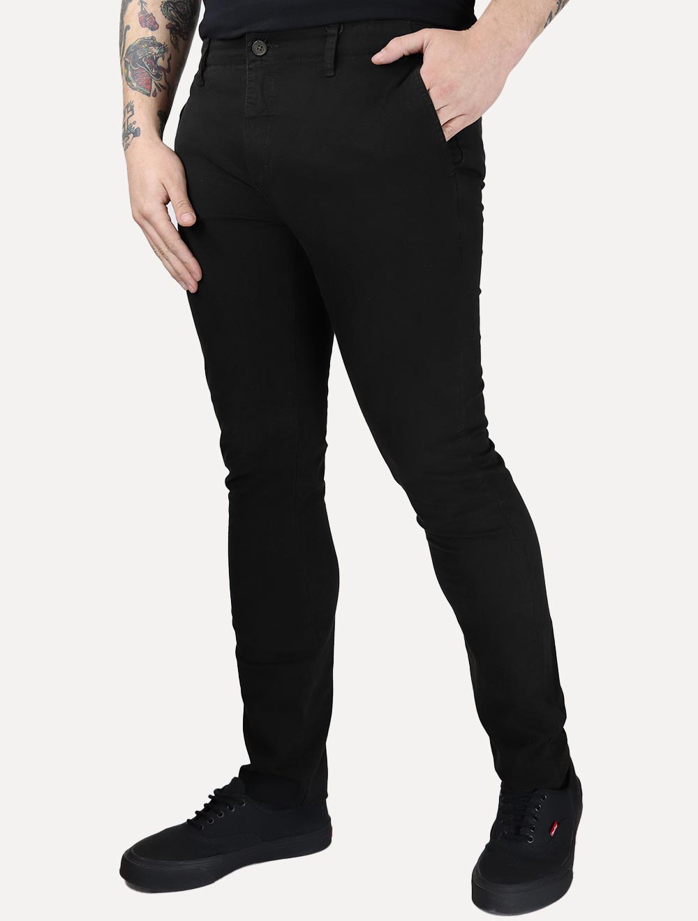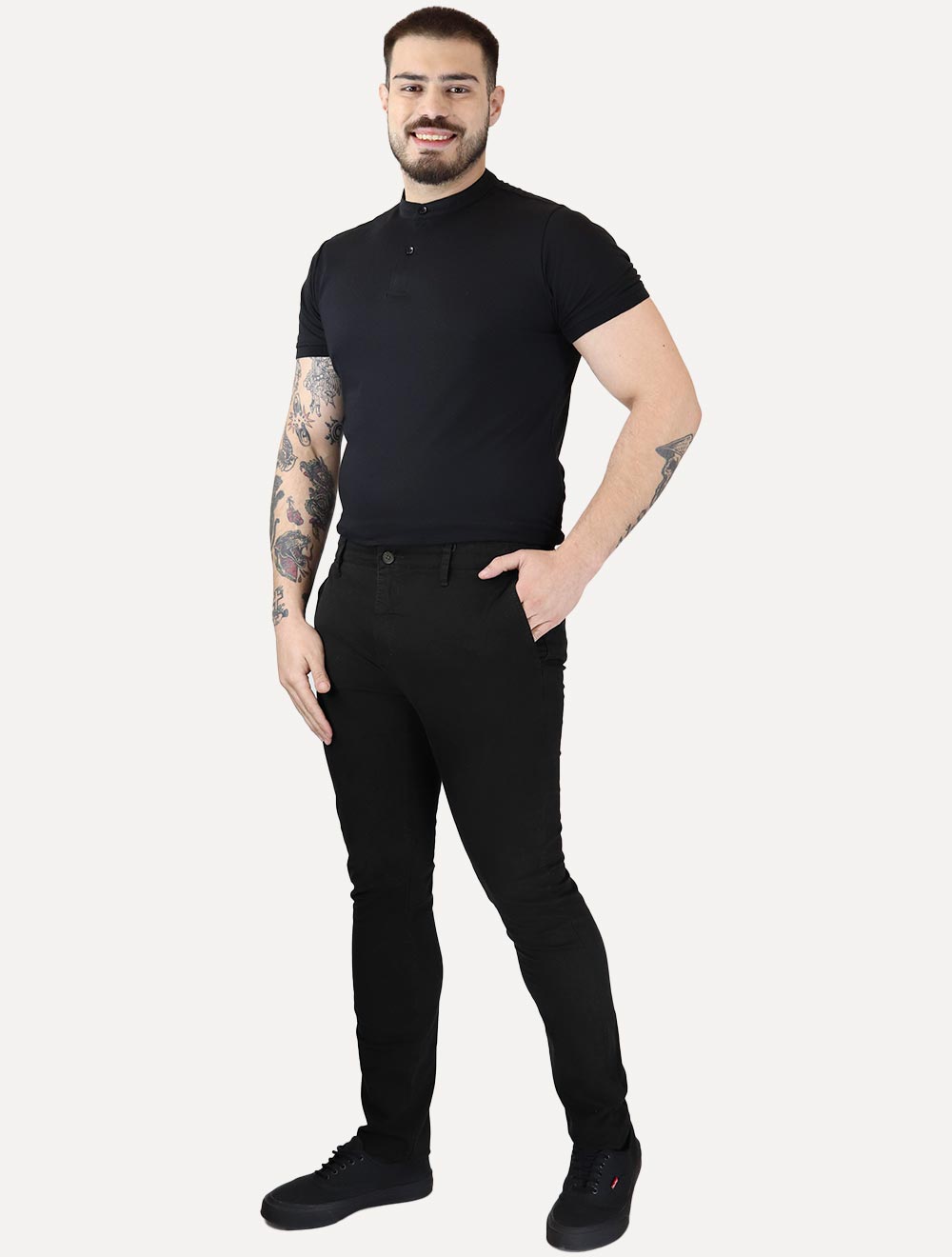 Apresentando a atemporal modelagem clássica chino, a peça conta com cós reto estruturado, passantes elegantes para cinto e fechamento frontal discreto por zíper e botão. Os bolsos são cuidadosamente desenhados para funcionalidade e estilo: bolsos frontais em faca e bolsos traseiros embutidos, ambos com acabamento refinado.