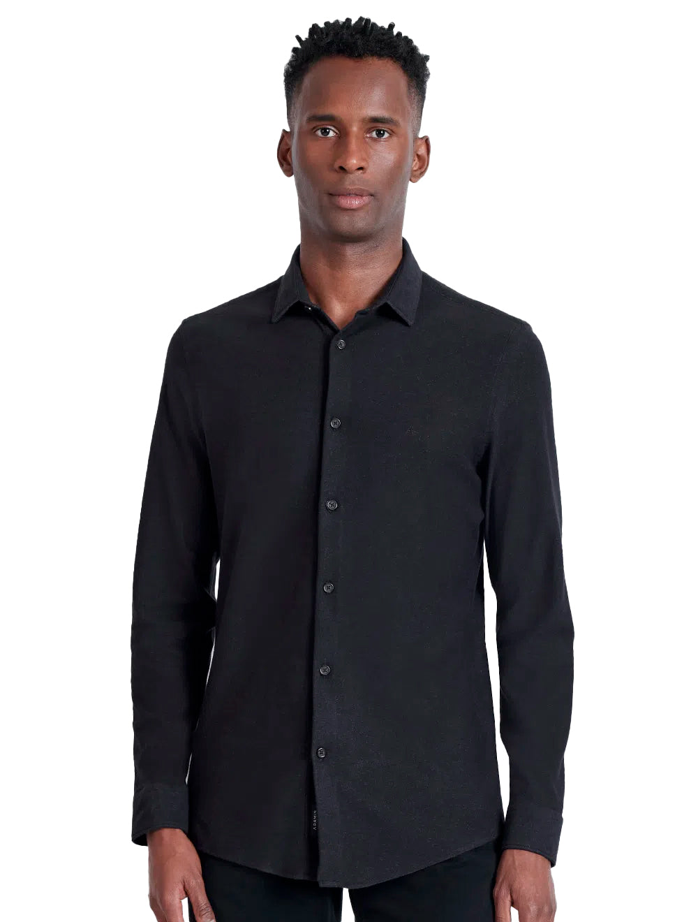 A camisa é confeccionada em malha dupla de algodão e poliéster com modelagem slim.
