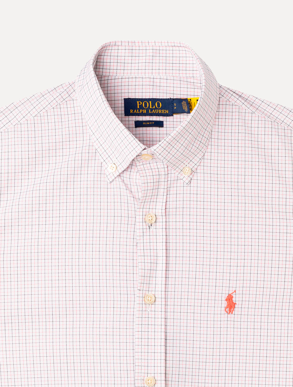 Camisa manga longa masculina Ralph Lauren xadrez nas cores branca e coral.