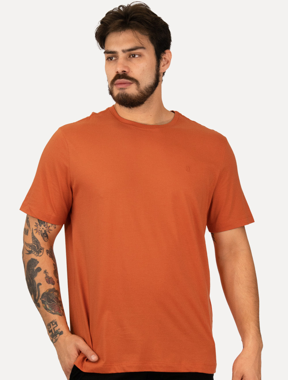 Camiseta masculina manga curta Individual na cor laranja médio.
