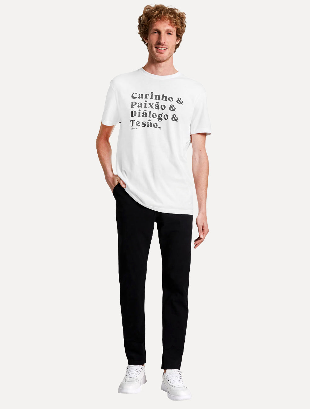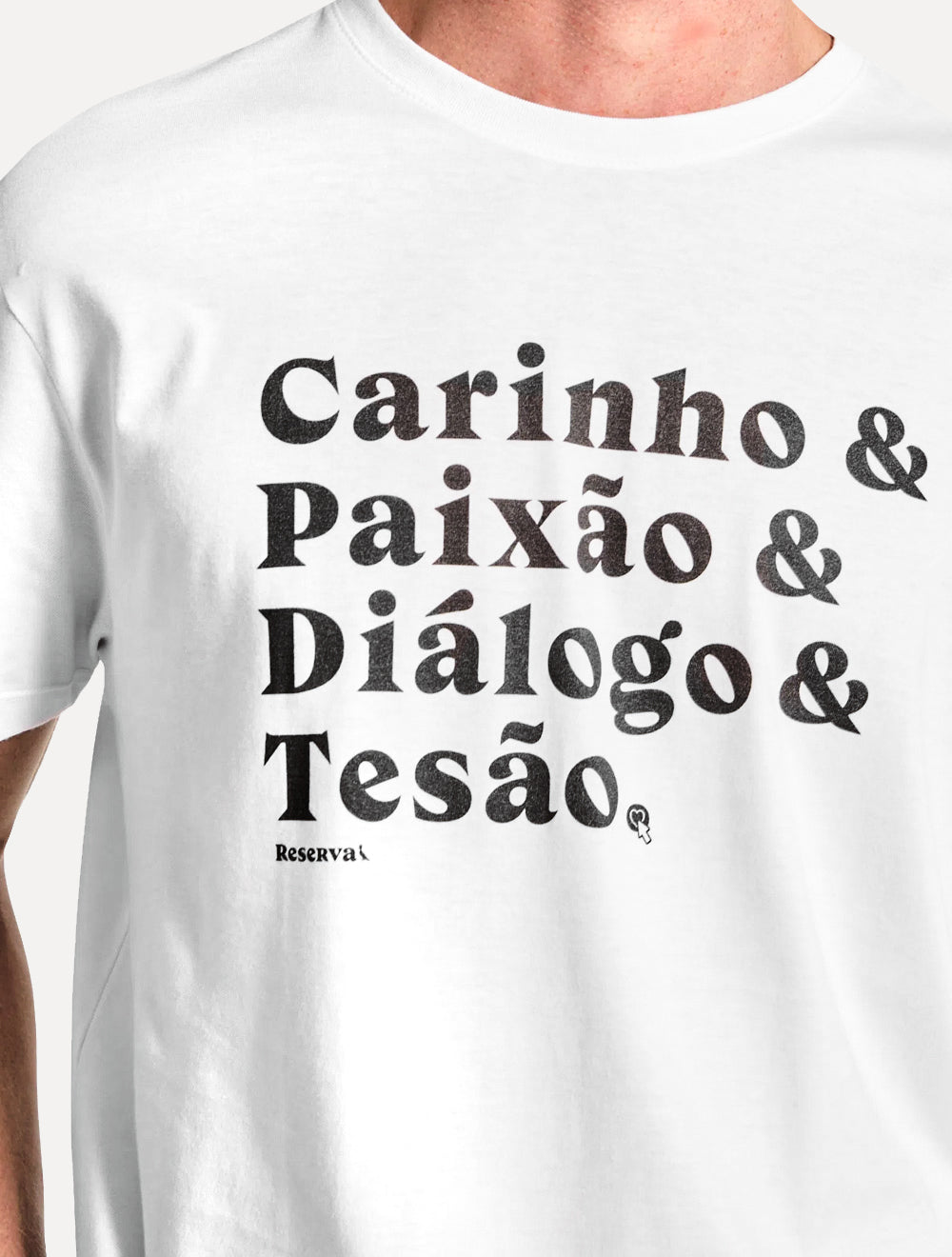Estampa tipográfica frontal "carinho & paixão & diálogo & tesão", na cor preta.