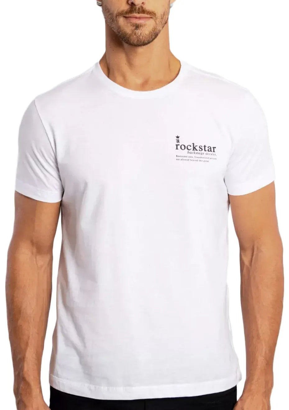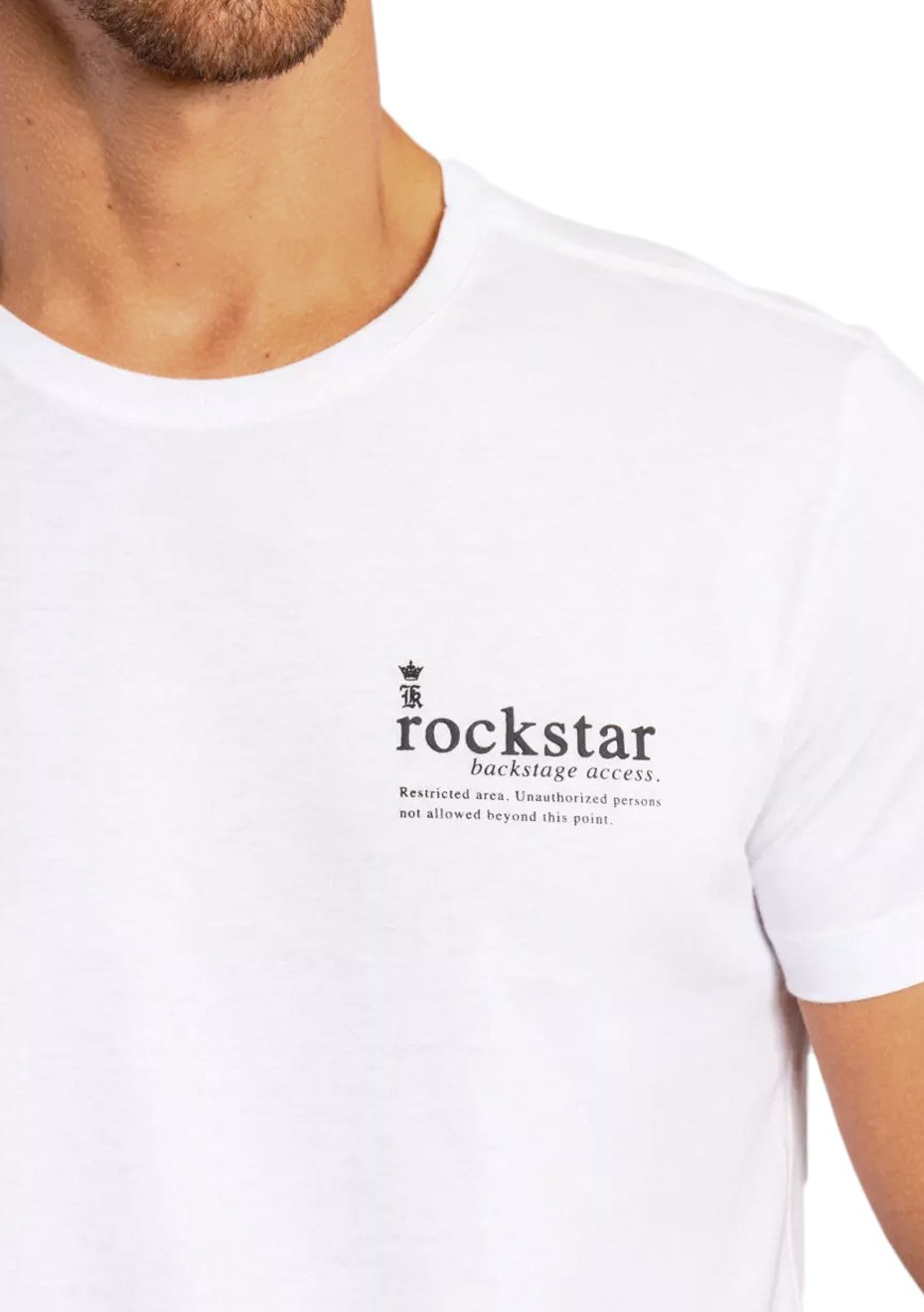 Estampa frontal com o logotipo da marca e a palavra "rockstar" em alto relevo, seguida de "backstage access. Restricted area. Unauthorized persons not allowed beyond this point.", na cor preta.