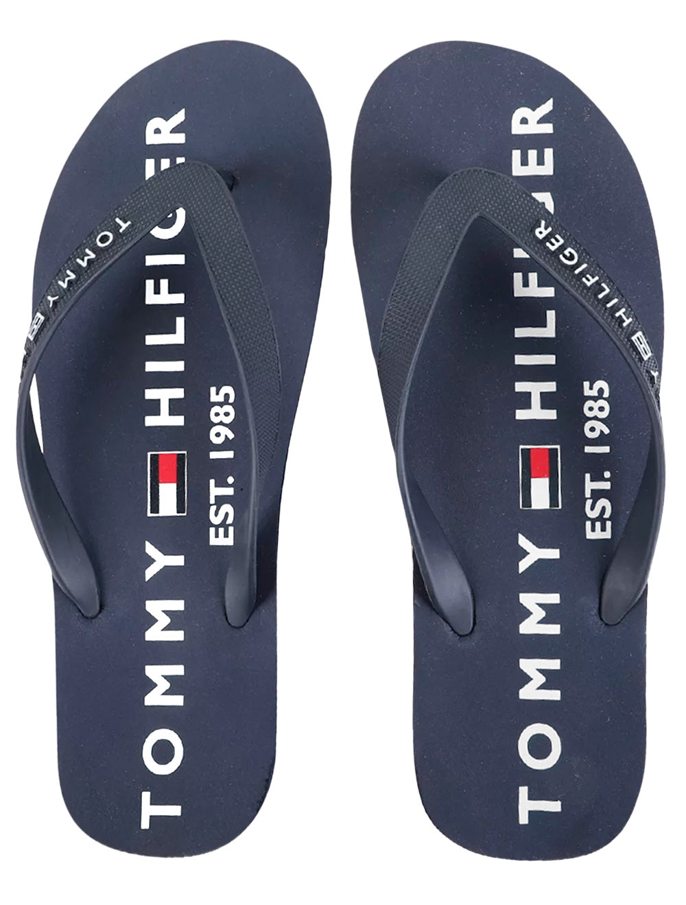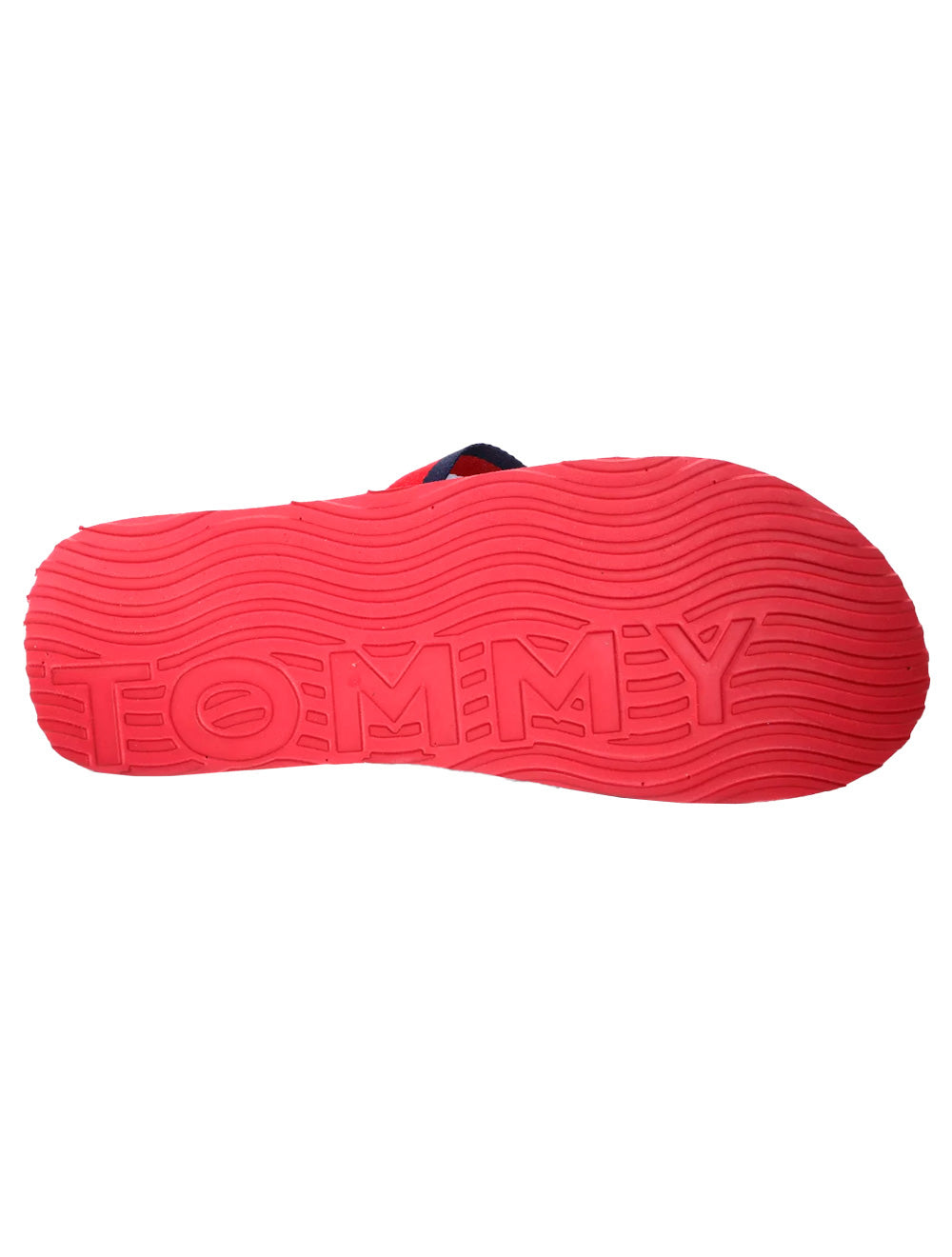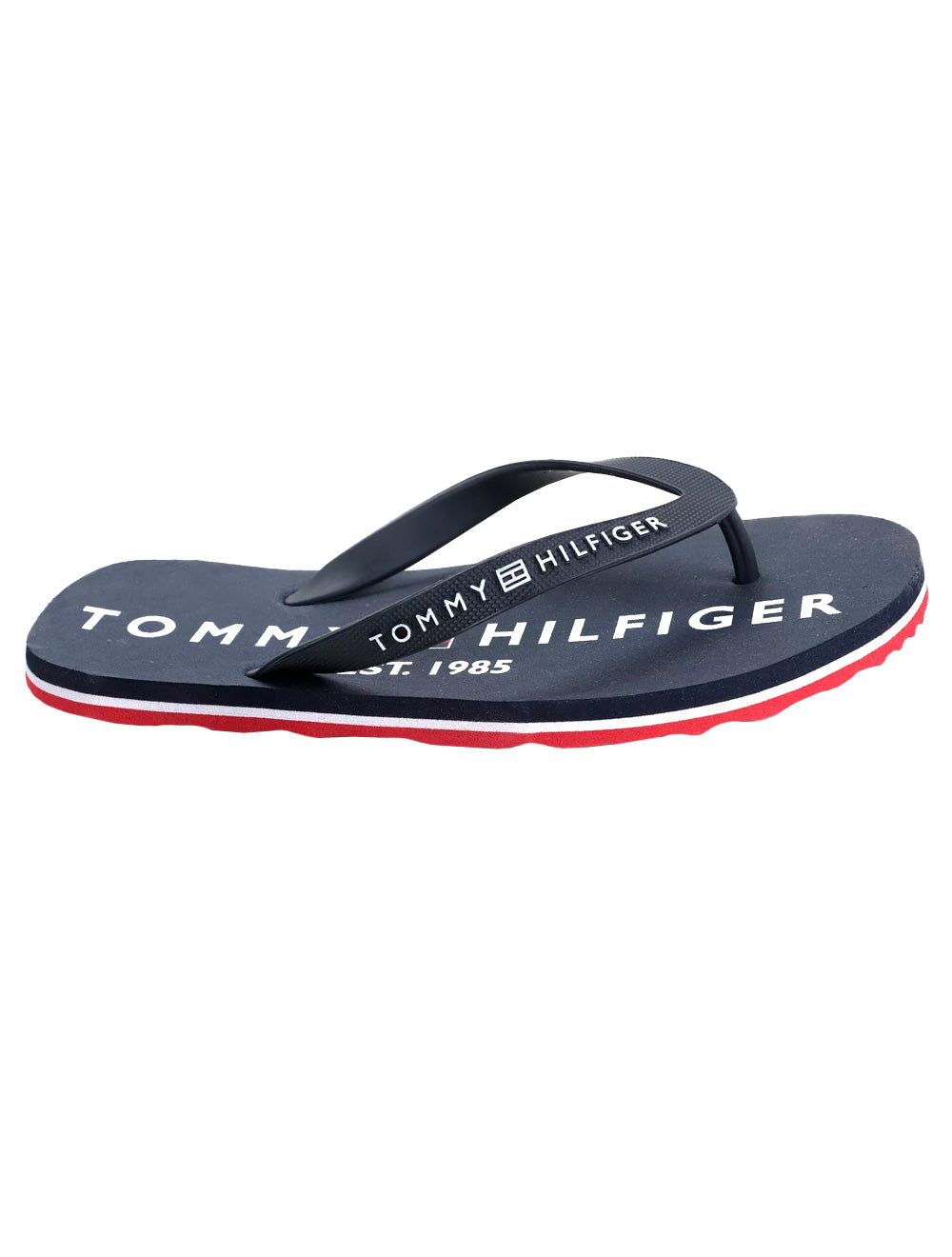 Chinelo de tiras masculino Tommy Hilfiger na cor azul marinho com solado vermelho.