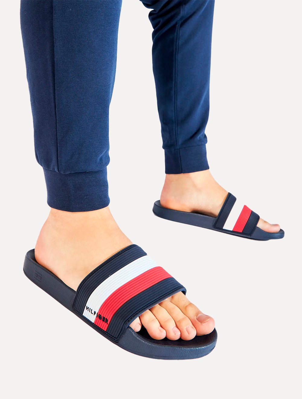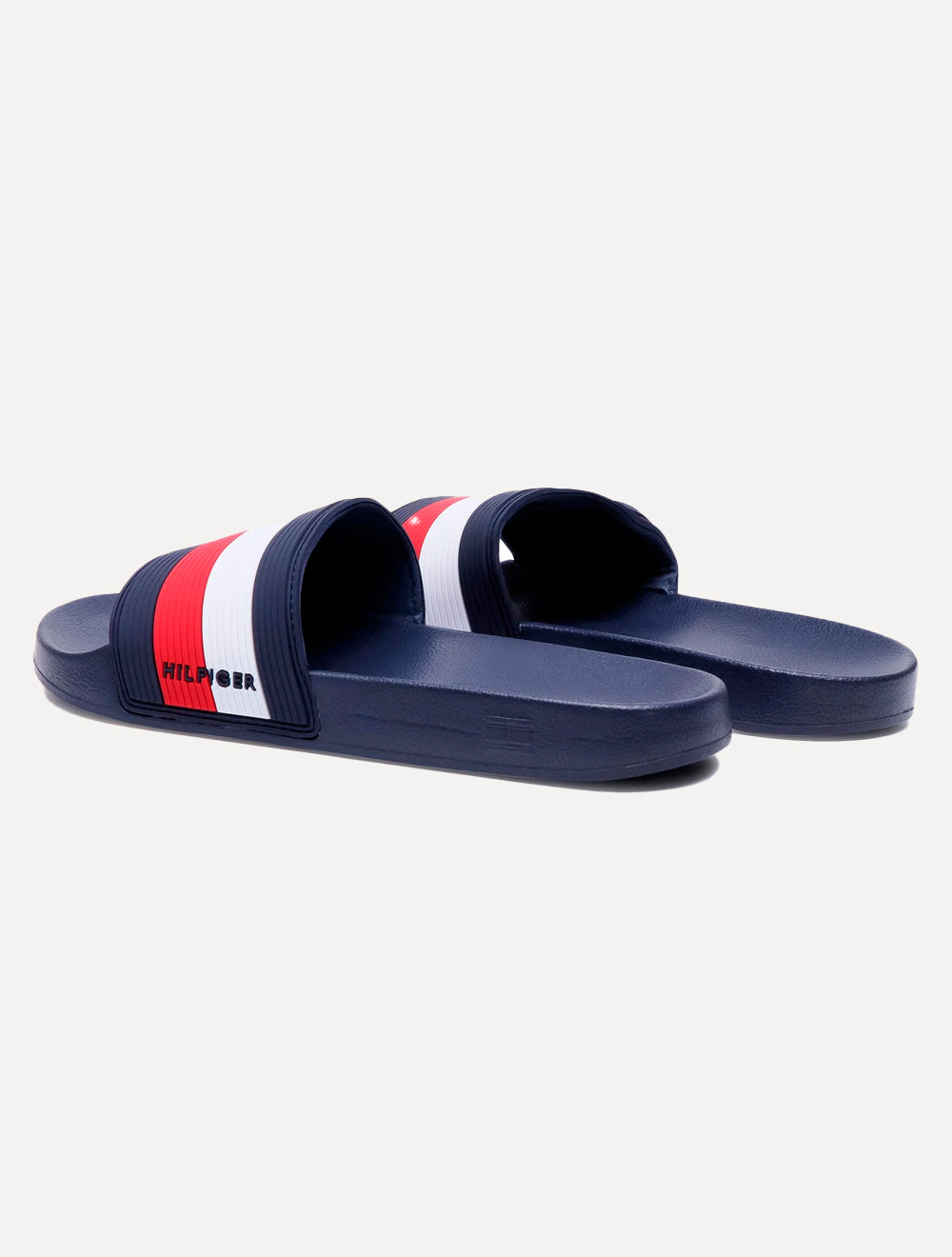 Chinelo slide masculino Tommy Hilfiger na cor azul marinho.