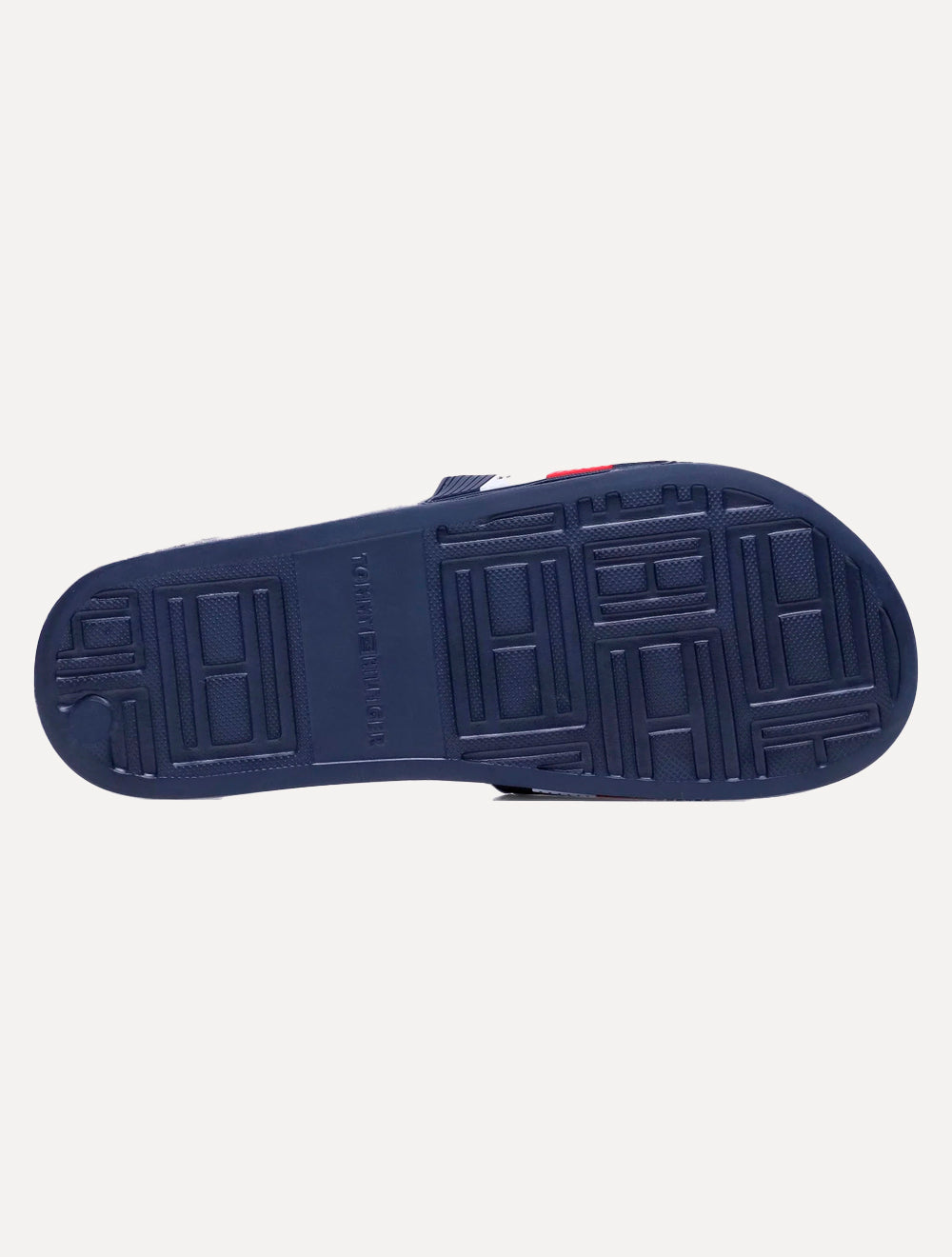 Sola antiderrapante emborrachado com nome "HILFIGER" da marca em baixo relevo na sola.