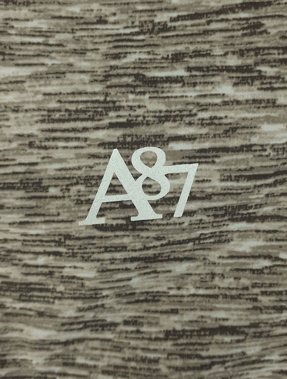 Estampa tipográfica "A87", na cor prata, no lado esquerdo do peito.