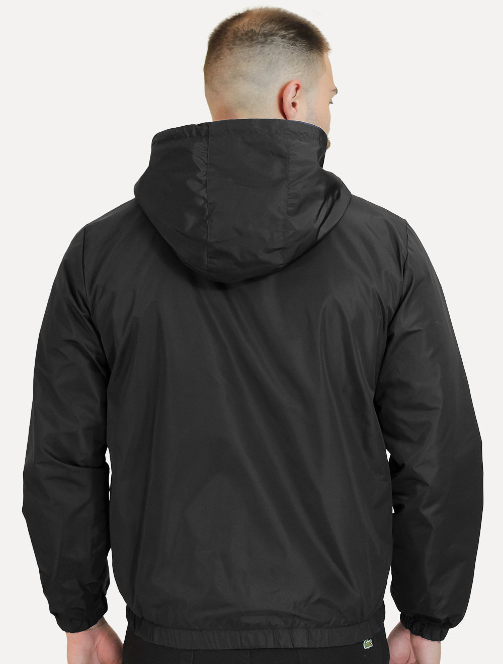 Capuz removível com ajuste por cordões elásticos.