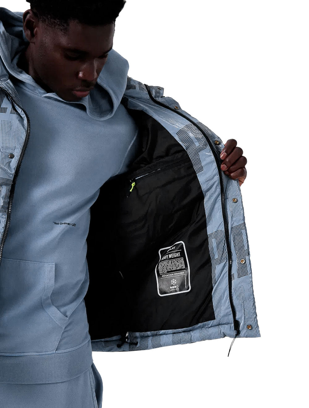 Possui um bolso interno no lado esquerdo do peito, com fechamento por zíper.