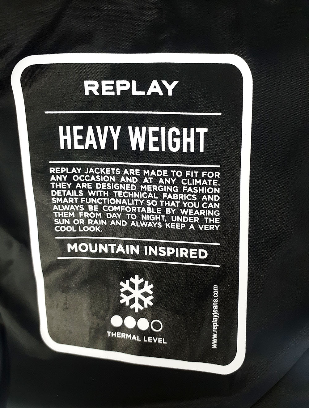 Possui a descrição "Replay Heavy Weight" embaixo do bolso interno.