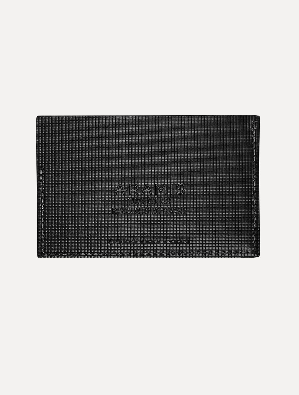 Kit contendo um porta cartão e um chaveiro exclusivo Aramis em couro na cor preta.