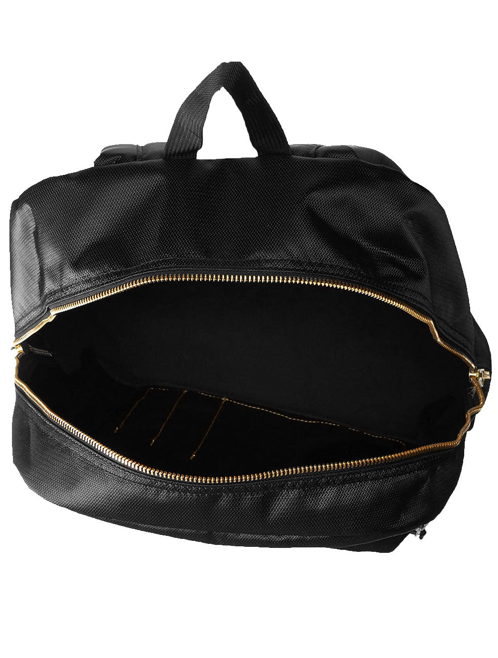Possui espaçoso compartimento principal e bolso frontal com divisórias, ambos com fechamento por zíper na cor dourada.