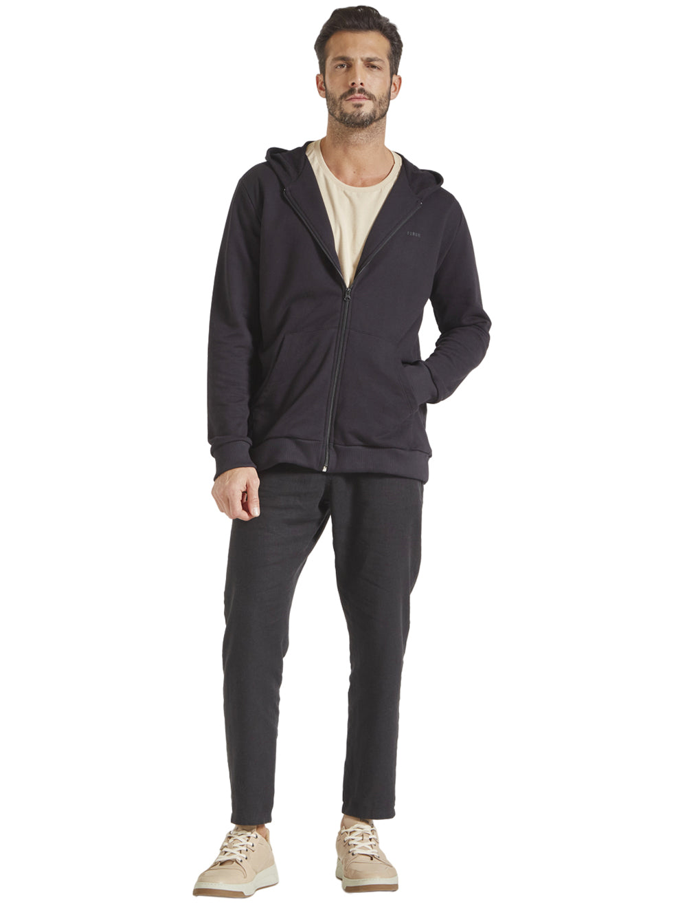 Fechamento frontal por zíper preto.