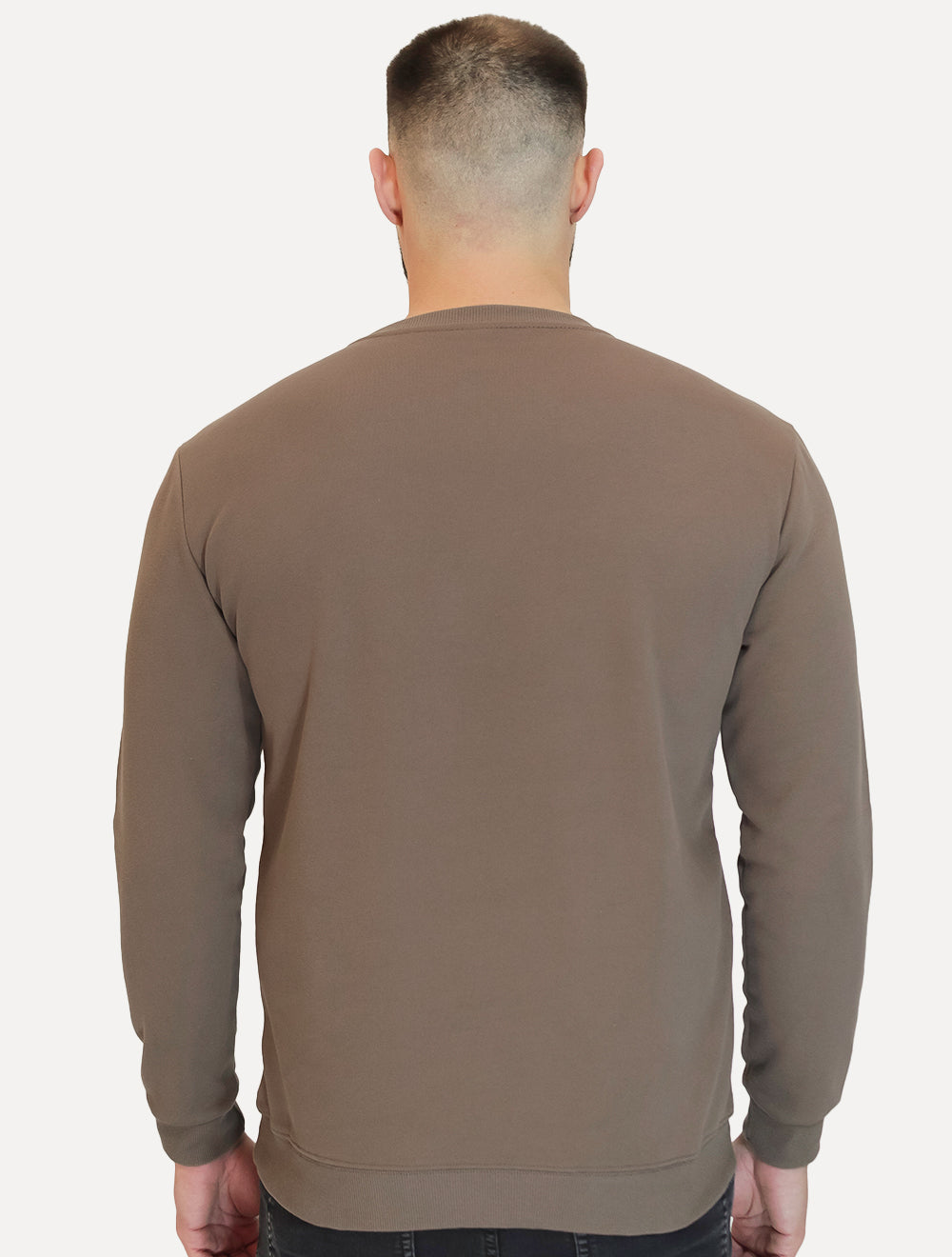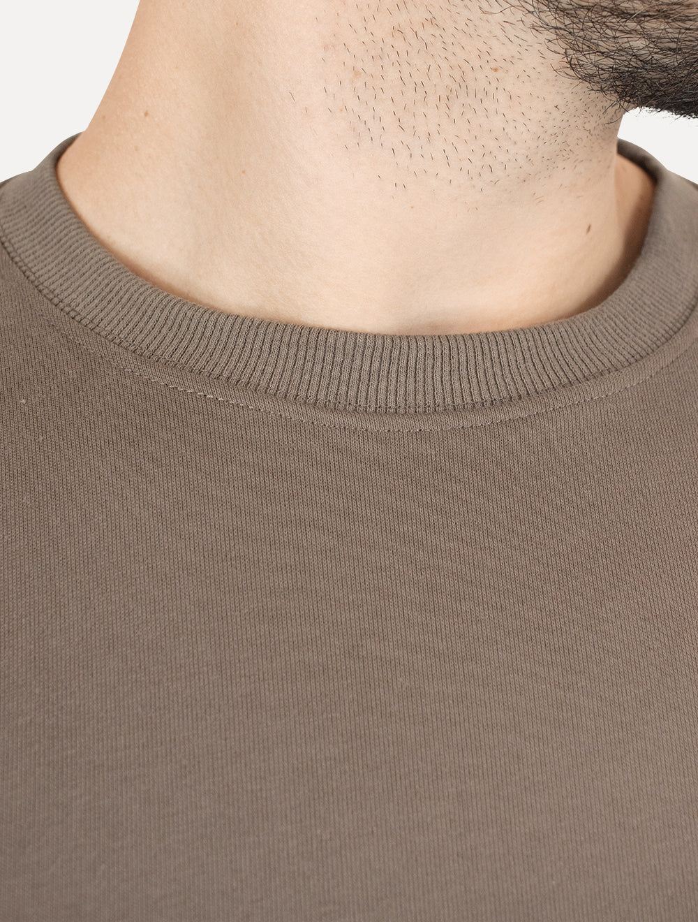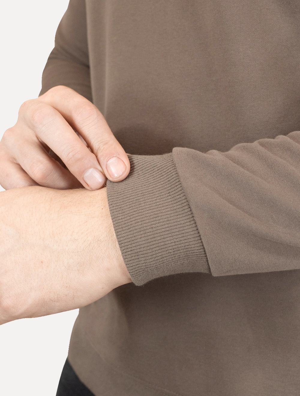 Possui gola redonda, punhos e barra com acabamento canelado.