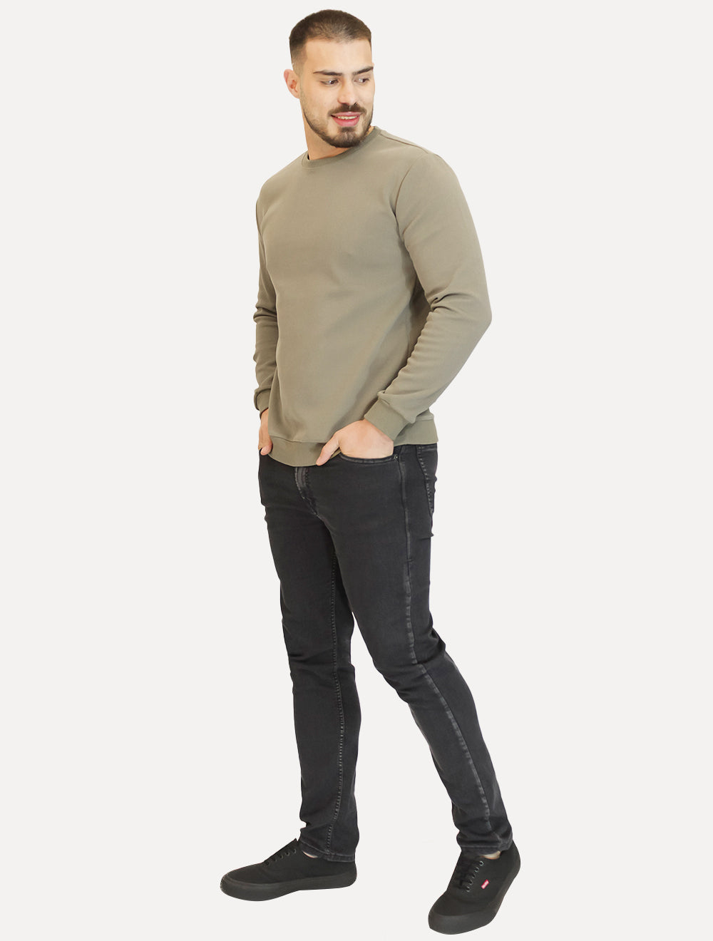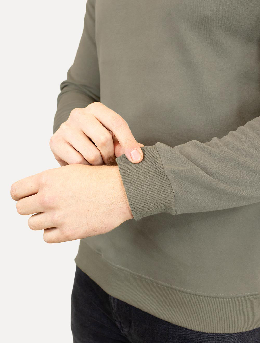 Possui gola redonda, punhos e barra com acabamento canelado.