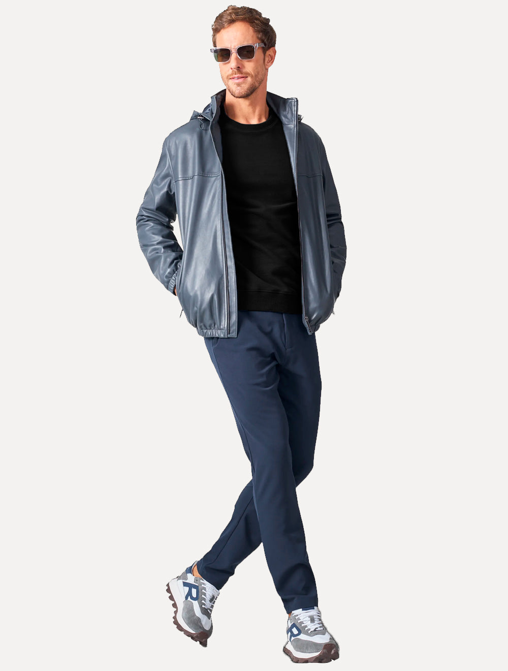 Possui gola redonda com acabamento canelado, na barra e nas mangas.