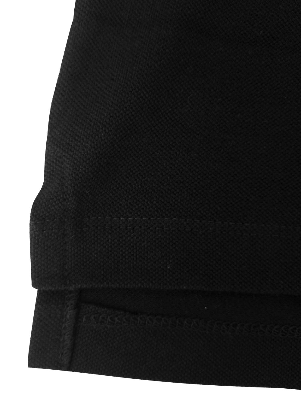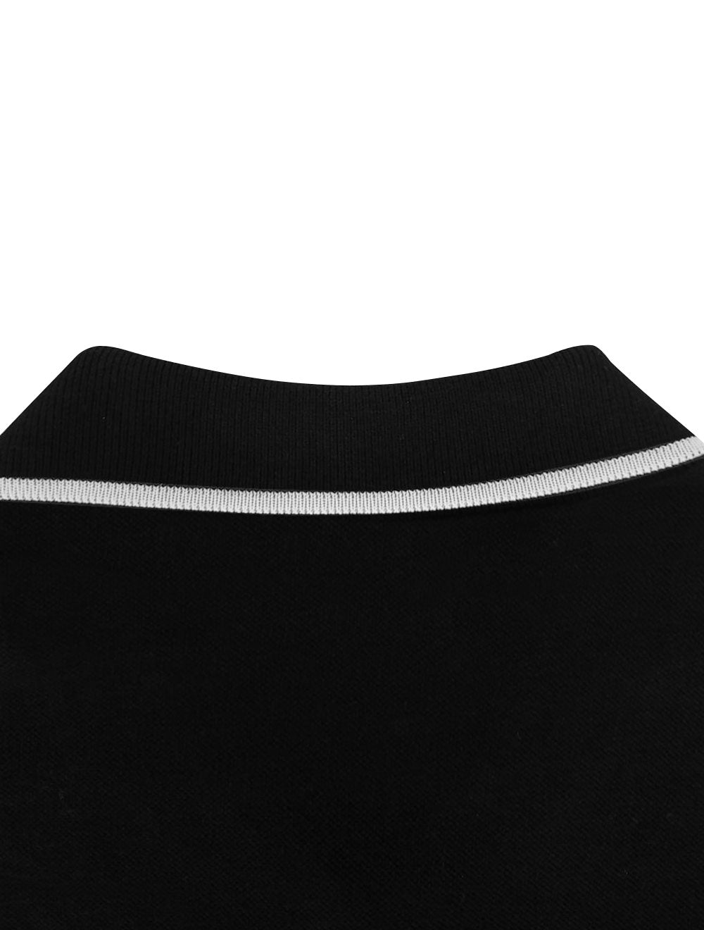Possui gola clássica com acabamento canelado e mangas curtas.