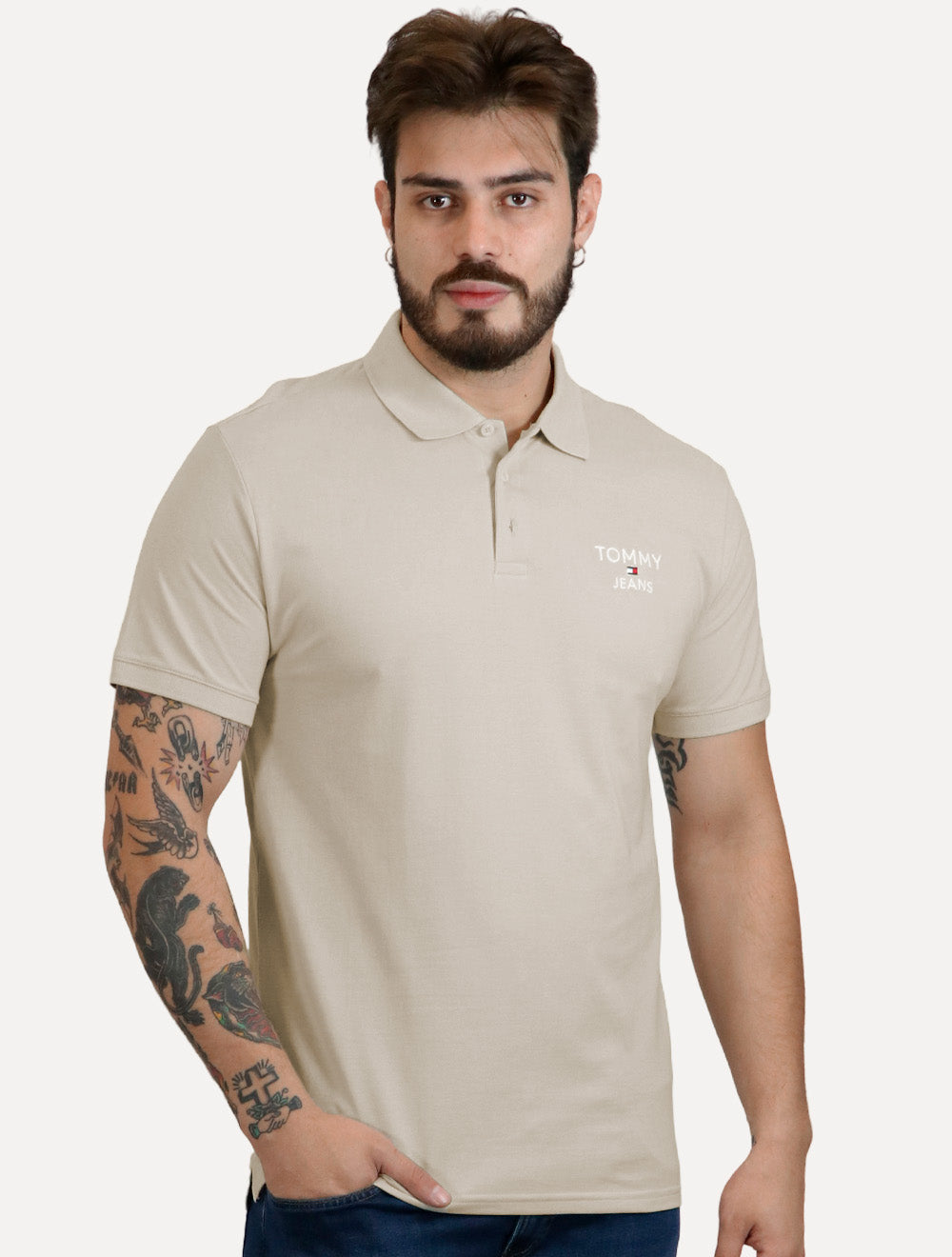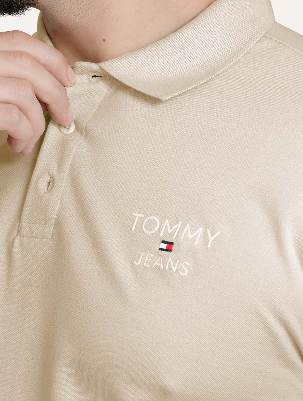 Polo Tommy Jeans masculina na cor areia.