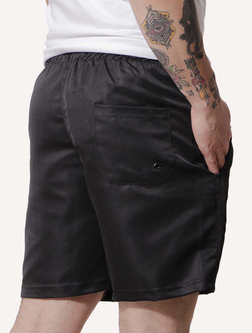 Possui dois bolsos retos frontais e um bolso traseiro com ilhós preto.