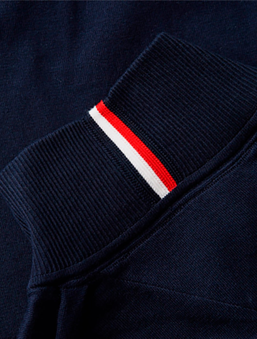 Esse suéter com fechamento em zíper apresenta um detalhe discreto da marca, com a faixa da assinatura atrás do pescoço e a clássica bandeira bordada.