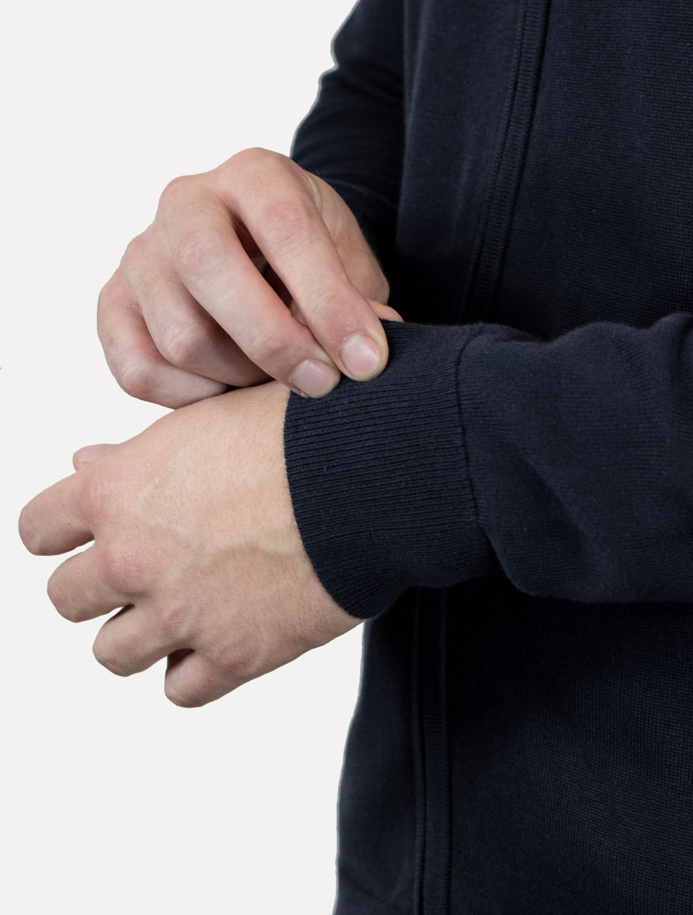 Esse suéter com fechamento em zíper apresenta um detalhe discreto da marca, com a faixa da assinatura atrás do pescoço e a clássica bandeira bordada.