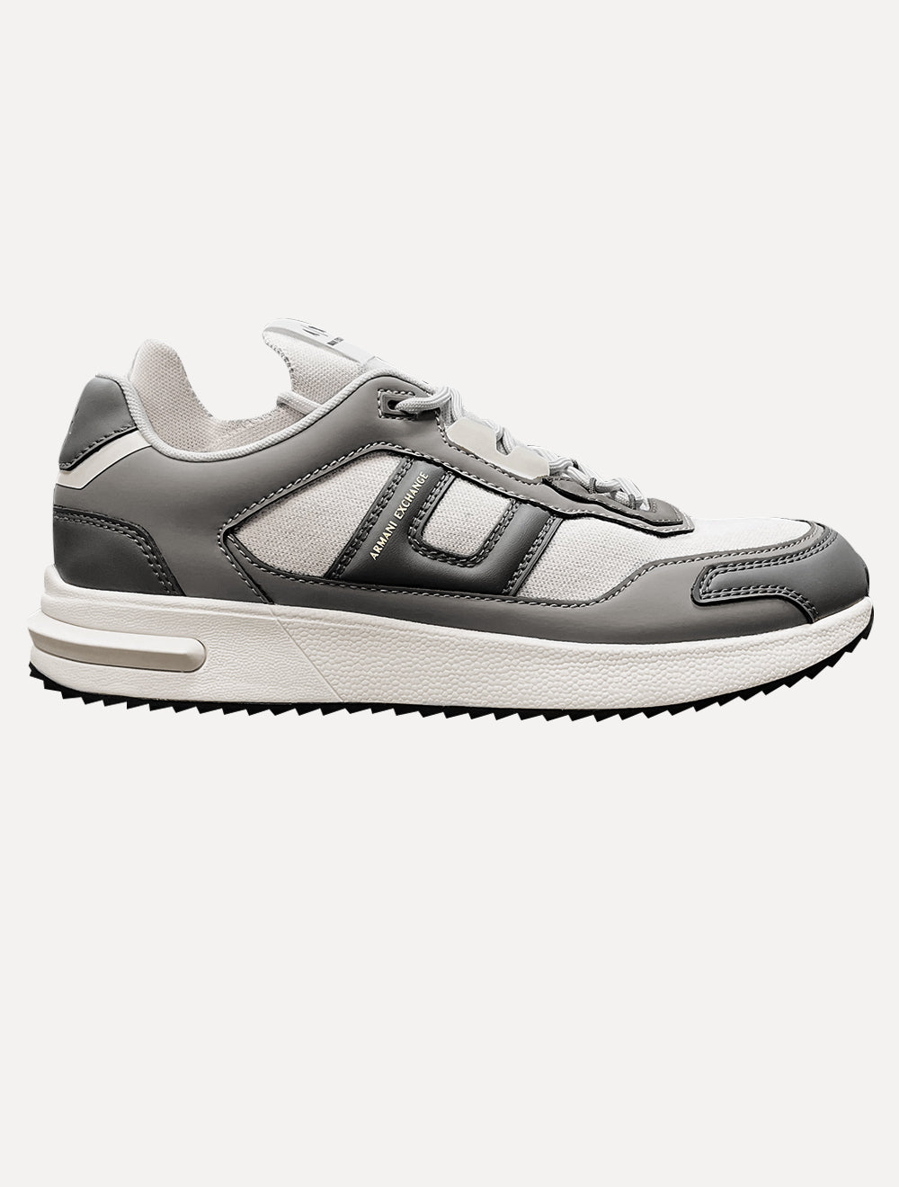 Tênis masculino Armani Exchange nas cores preto e cinza com detalhes em branco.