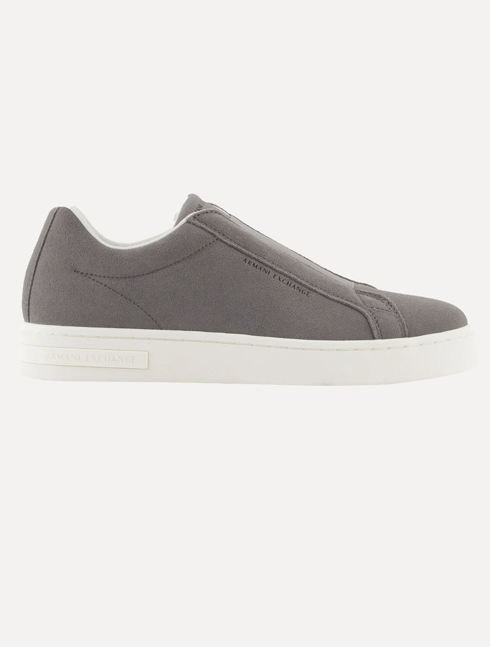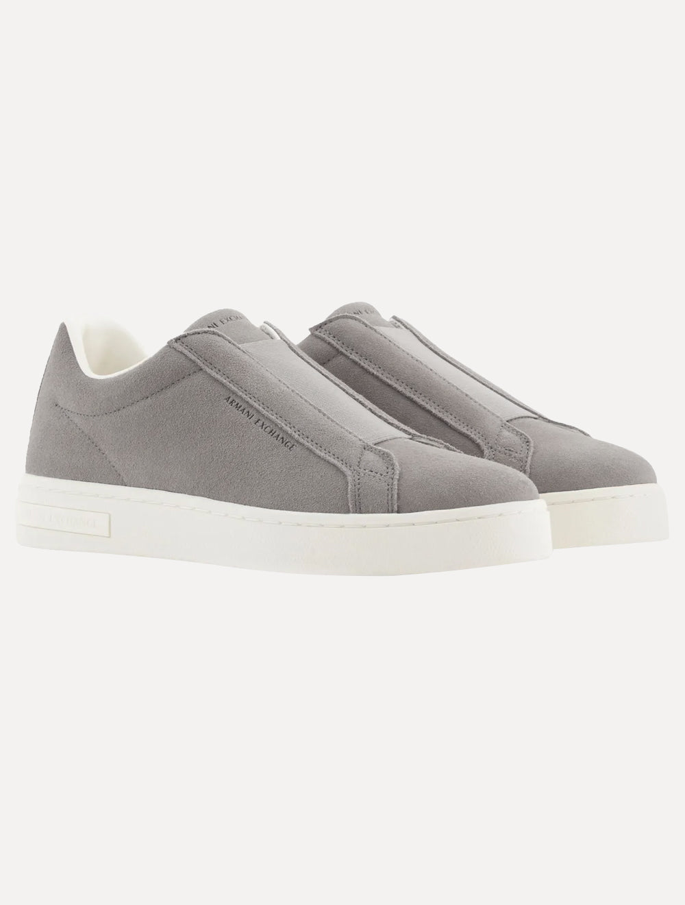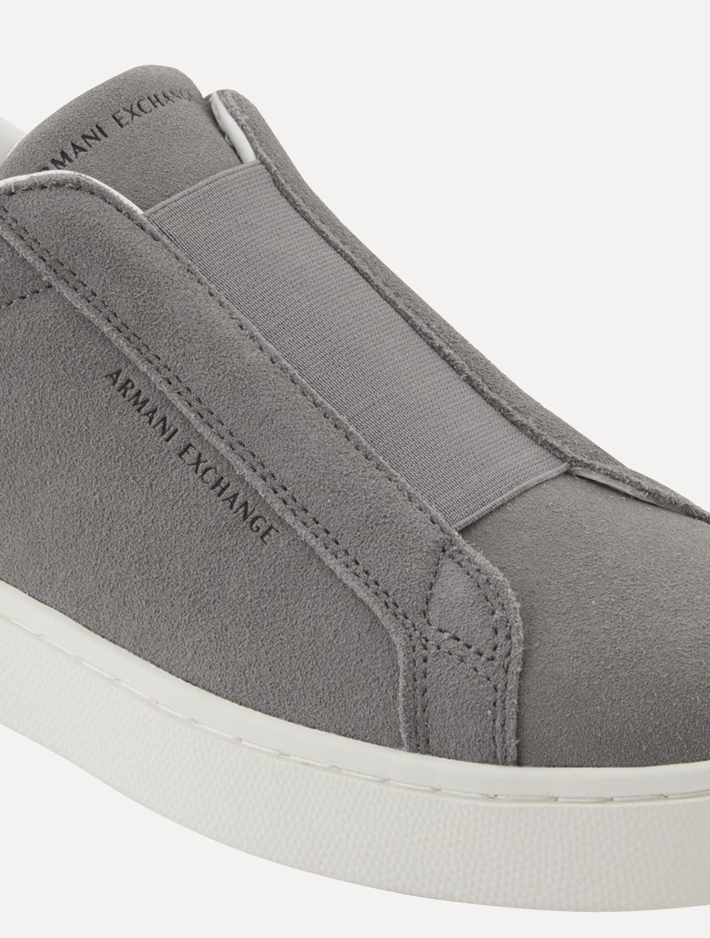 Tênis masculino Armani Exchange modelo London Slip-On, na cor cinza com solado branco.